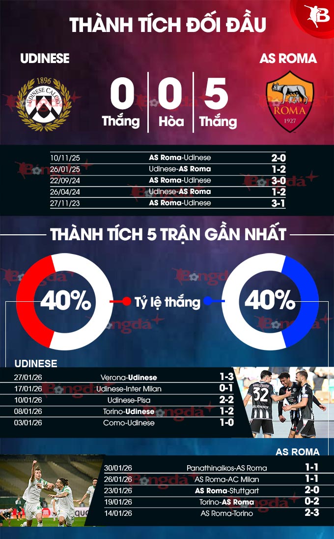 Xét về thành tích đối đầu, Udinese lại càng có lý do để lo ngại, do họ không được lịch sử ủng hộ. Ở trận lượt đi, Udinese từng thất thủ 0-2 tại thủ đô Italia và đây đã là trận thua thứ 6 liên tiếp của họ dưới tay Roma. Căn cứ vào chuyện Udinese rất hay để Roma bắt nạt, sẽ chẳng bất ngờ nếu họ lại một lần nữa gục ngã trước "hung thần".