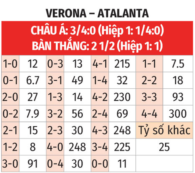 - Lẻ bàn thắng: 10/15 trận đối đầu gần nhất giữa 2 CLB có tổng bàn thắng chia hết cho 2. Ngoài ra, 3/4 trận vừa qua của Verona lẫn Atalanta đều chứng kiến điều tương tự.