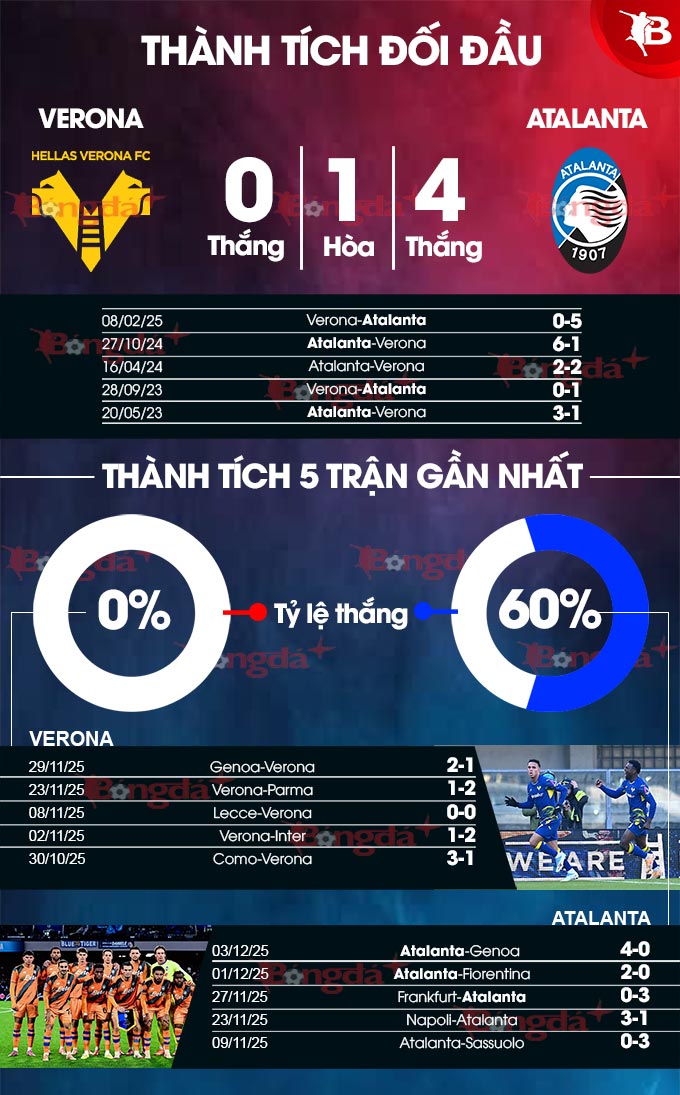 Verona có lợi thế sân nhà nhưng không thắng tại đây kể từ khi mùa giải mới khởi tranh. Ngoài ra, Atalanta lại vượt trội về nhiều mặt, bao gồm cả đối đầu trực tiếp khi thắng 7/9 lần so tài gần nhất. Nhiều khả năng, trận đấu này sẽ kết thúc với thắng lợi cho Atalanta.