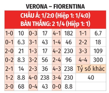 - 3 bàn trở lên: 7 trận sân khách gần đây của Fiorentina, NHM được thưởng thức cả thảy 24 pha lập công, bình quân hơn 3 bàn/trận, 100% đạt tối thiểu 3 bàn. Trong 9 trận Serie A vừa qua khi Verona được nhường 1/2 đến 1 ¼ bàn, 8 trận có 3 bàn trở lên. Biến cố tương tự cũng xảy ra ở 3/4 lần chạm trán gần nhất giữa đôi bên.