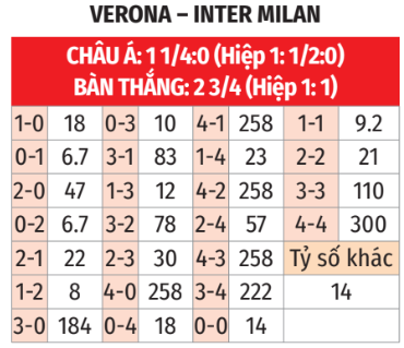 - Inter thắng theo châu Á: Verona thua theo châu Á cả 4 trận Serie A gần đây với tỷ lệ châu Á khác 0. Inter thắng theo châu Á 6/7 trận chính thức vừa qua. 5 lần đối đầu gần nhất trên sân của Verona, Inter thắng 3, hòa 1 và chỉ thua 1 theo châu Á. Inter nhường 1 ¼ bàn là rất sâu khi họ đá sân khách, Nerazzurri sẽ thắng với cách biệt tối thiểu 2 bàn.
