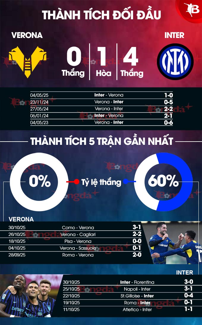 - Nhiều bàn thắng: 5/6 trận chính thức gần đây của Inter có tối thiểu 3 bàn. 9 lần đối đầu gần nhất giữa đôi bên trên sân Bentegodi, NHM được thưởng thức cả thảy 38 bàn, trung bình hơn 4 bàn/trận và 100% có tối thiểu 3 lần lưới rung.