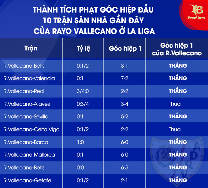 + Rayo Vallecano thắng phạt góc hiệp 1 tới 8/10 trận sân nhà gần đây tại La Liga.