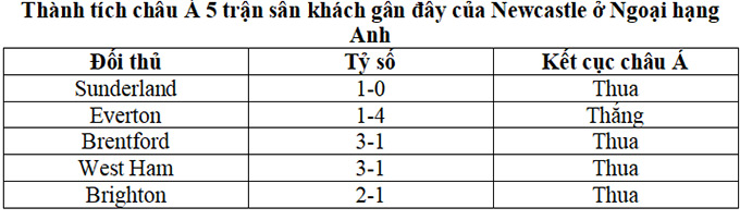 + Newcastle thua châu Á ở 6/7 trận sân khách vừa qua.