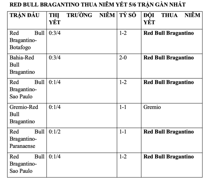 + Red Bull Bragantino đang chơi rất tệ trong mùa giải mới. Bằng chứng là họ đã không thắng 6 trận liền, nhận 4 thất bại. Trên sân nhà, Red Bull Bragantino cũng không thắng 4 trận liền, thua 3. Theo niêm yết thì Red Bull Bragantino cũng gây thất vọng khi đã thua niêm yết 5/6 trận gần nhất. Trên sân nhà thì Red Bull Bragantino cũng thua niêm yết toàn bộ 4 trận gần nhất. Tóm lại, Red Bull Bragantino không phải đội bóng đáng tin lúc này.