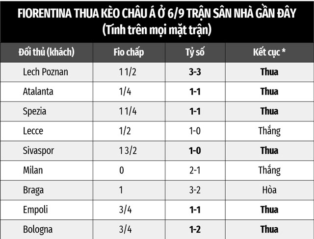Dù đang có phong độ cao, Fiorentina vẫn không giỏi đàn áp đối thủ yếu trên “thánh địa” Artemio Franchi. Đội bóng áo tím đã thua 6, hòa 1, thắng 2 theo kèo châu Á trong 9 trận chính thức gần nhất trên sân nhà khi là đội cửa trên. Ngoài ra, Fio cũng thua kèo châu Á ở 3/4 trận đấu trở lại đây tính trên mọi mặt trận.