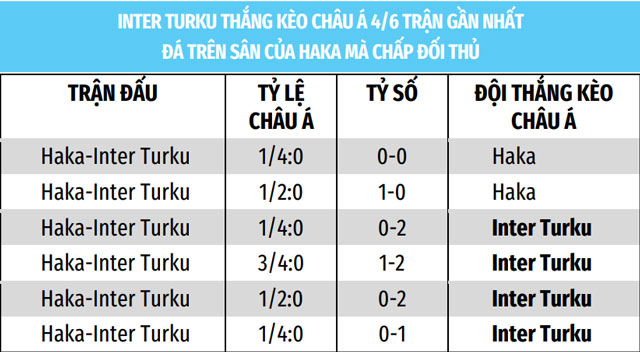 Tiếp theo, Inter Turku trận này chấp 1/4 trái bóng. Mà thống kê cho thấy Inter Turku thắng kèo châu Á 5/7 trận đối đầu gần nhất với Haka trên sân khách mà chấp đối thủ từ 1/4 - 3/4 trái bóng. Chưa hết, Inter Turku cũng thắng kèo châu Á 3/3 trận gần nhất ở giải VĐQG mà chấp đúng 1/4. Cuối cùng, trận lượt đi đá sân nhà, Inter Turku chấp 1/4 và đã thắng 3-0. Nhưng tới lượt về sân khách mà vẫn chỉ chấp 1/4. Nhiều khả năng họ sẽ thắng kèo châu Á.