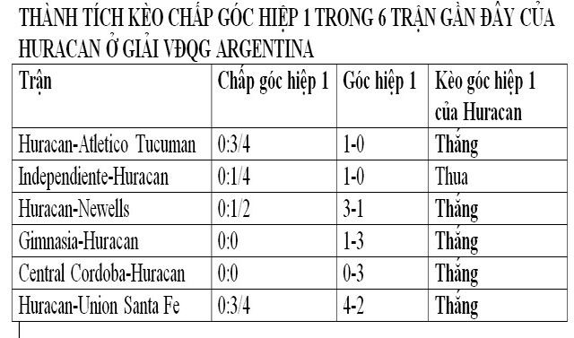 Huracan thắng kèo chấp phạt góc hiệp 1 ở 5/6 trận gần đây tại giải VĐQG Argentina. Đặc biệt trong số này Huracan chỉ phải chịu đúng 5 góc trong 45 phút đầu, nghĩa là chưa tới 1 góc/hiệp 1. Nếu mở rộng ra mọi giải đấu chính thức thì trong 9 trận gần nhất, thành tích kèo chấp góc hiệp 1 của Huracan là thắng 7, hòa 1, thua 1.