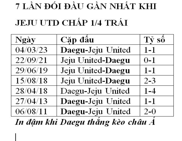 Chưa kể, 7 trận đối đầu gần nhất Jeju United chấp kèo 0:1/4 tương tự trận này, họ nhận 4 thất bại, 2 trận hòa và chỉ thắng 1 trận. Một chi tiết đáng chú ý khác, 8 trận đối đầu gần nhất giữa hai đội thì đội cửa dưới đều vượt kèo thành công.