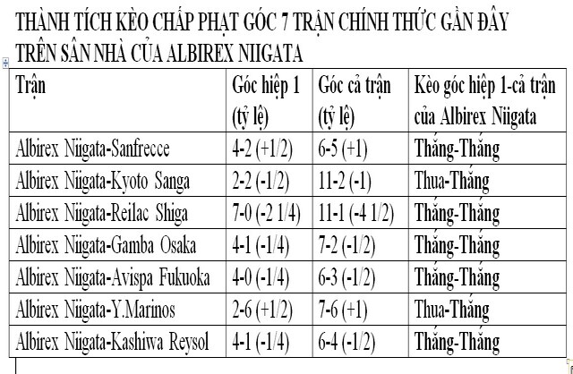 Albirex Niigata cày góc rất khủng khiếp trên sân nhà. Cả 7 trận chính thức vừa qua trên sân nhà, Albirex Niigata đã được hưởng cả thảy 54 quả phạt góc, bình quân lên tới 7,71 quả/trận. Thống kê này lý giải vì sao Albirex Niigata thắng kèo chấp phạt góc 100% trong số này, 5 lần thắng kèo chấp góc hiệp 1.
