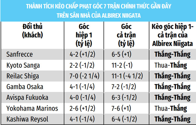 Albirex Niigata cày góc rất khủng khiếp trên sân nhà. Cả 7 trận chính thức vừa qua trên sân nhà, Albirex Niigata đã được hưởng cả thảy 54 quả phạt góc, bình quân lên tới 7,71 quả/trận. Thống kê này lý giải vì sao Albirex Niigata thắng kèo chấp phạt góc 100% trong số này, 5 lần thắng kèo chấp góc hiệp 1.