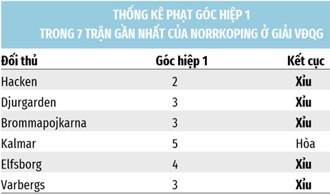 Cả 6 trận gần đây của Norrkoping ở giải VĐQG đều không nổ tài góc hiệp 1 (5 xỉu, 1 hòa). Lối chơi của Norrkoping đang thay đổi đáng kể trong cách nhập cuộc, dẫn tới sự hiếm hoi phạt góc trong hiệp đầu.