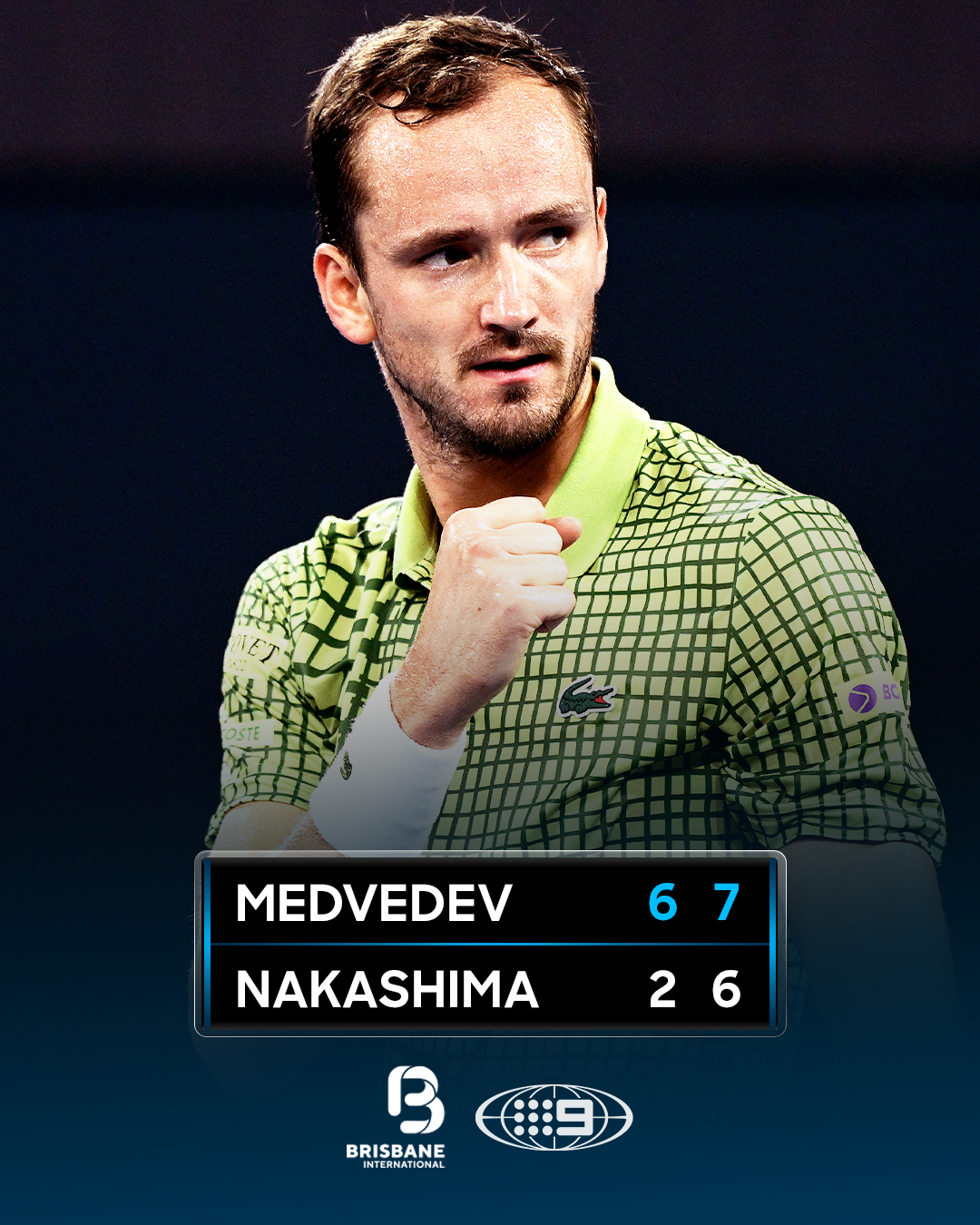 Hiện xếp hạng 13 thế giới, Medvedev tỏ ra vượt trội trong set đầu tiên trước tay vợt người Mỹ. Sang set hai, Nakashima thi đấu kiên cường và tạo ra không ít khó khăn, nhưng bản lĩnh của Medvedev đã lên tiếng đúng lúc. Chiến thắng này giúp tay vợt người Nga có sự chuẩn bị lý tưởng trước thềm Australian Open.