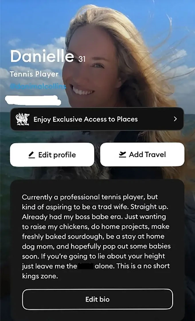 "Tôi đã trải qua giai đoạn ‘cô nàng sự nghiệp’ rồi. Giờ chỉ muốn nuôi gà, làm việc nhà, nướng bánh mì chua, làm mẹ chăm chó ở nhà, và hy vọng sớm có vài đứa con. Nếu bạn định nói dối về chiều cao thì tốt nhất là đừng tiếp cận tôi. Khu vực này không chấp nhận các ‘ông vua nấm lùn’ đâu”.