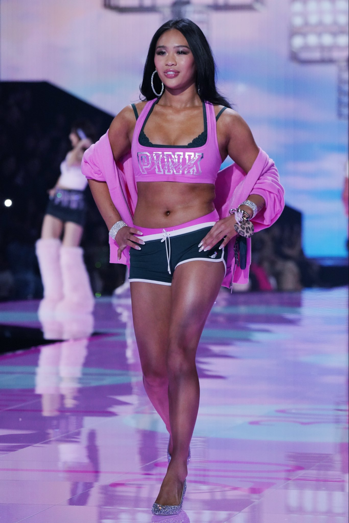 Ở sàn diễn của Victoria’s Secret, Suni Lee xuất hiện trong trang phục của dòng Victoria’s Secret PINK, gồm áo crop top hồng, quần short đen và đôi cánh thiên thần nhẹ nhàng phía sau. Với nụ cười rạng rỡ, cô khiến hàng nghìn khán giả trong khán phòng lẫn người xem toàn cầu phải dõi theo.