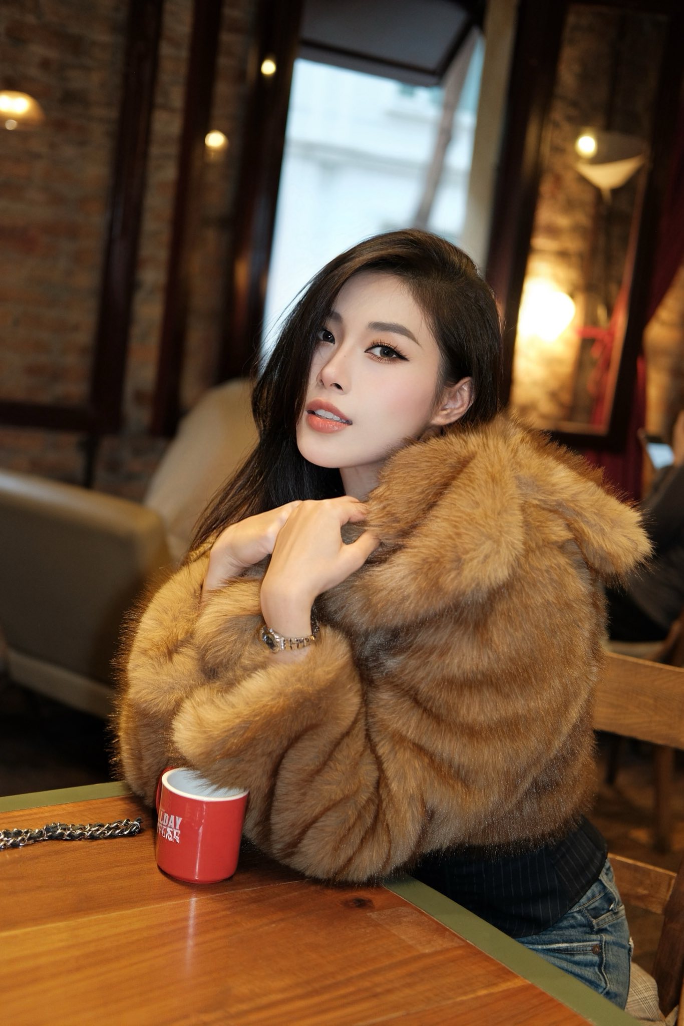 Nhiều anh chàng cảm thấy như "lạc lối" khi nhìn thấy nhan sắc của Thu Huyền trong bộ trang phục mùa đông với điểm nhấn là chiếc khăn quàng lông vũ bên tách cafe.