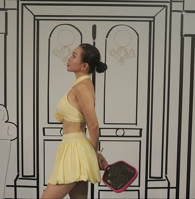 Hình ảnh Sĩ Thanh chơi pickleball mới đây gây nhiều chú ý. Cô chọn bộ đồ màu vàng với áo dáng croptop với điểm nhấn là cổ khoét sâu. Nữ ca sĩ trang điểm đậm, kỹ lưỡng.