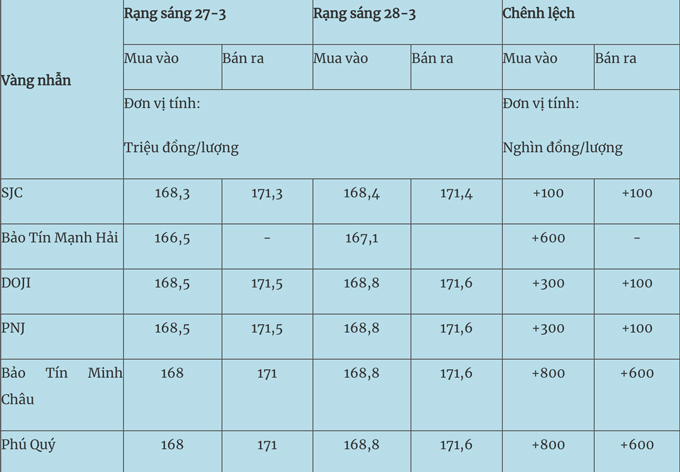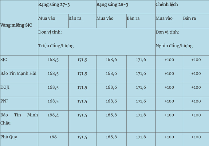 Chốt phiên giao dịch ngày 27/3, giá vàng miếng SJC niêm yết ở mức 168,6-171,6 triệu đồng/lượng (mua - bán), tăng nhẹ 100.000 đồng/lượng so với phiên trước.