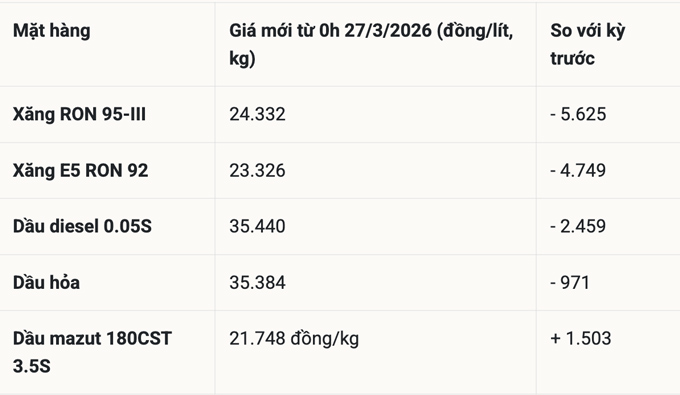 Tính đến thời điểm 05h00 sáng 28/3/2026, giá xăng dầu trong nước vẫn giữ nguyên mức điều chỉnh áp dụng từ 0h00 ngày 27/3. Tại kỳ điều hành này, liên Bộ Công Thương – Tài chính quyết định điều chỉnh giảm mạnh giá bán lẻ xăng dầu. Đây là mức giảm sâu hiếm thấy, thể hiện tác động trực tiếp từ chính sách điều hành mới của Chính phủ.