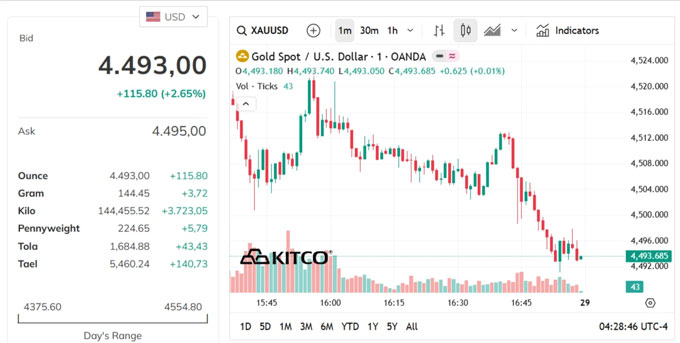 Theo Kitco, lúc 4h30 ngày 30/3 theo giờ Việt Nam, giá vàng tiếp tục neo ở mức 4.493 USD/ounce, không thay đổi so với phiên trước. Biên độ dao động vẫn duy trì trong khoảng 4.375 – 4.556 USD/ounce.