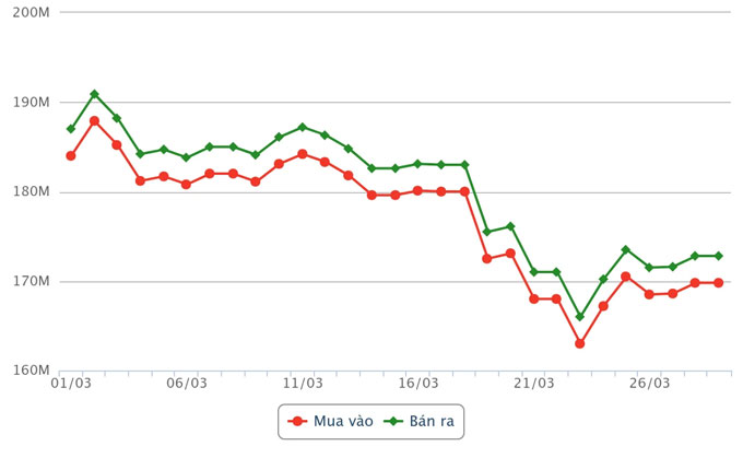 Tại thời điểm khảo sát lúc 4h30 ngày 30/3/2026, giá vàng trong nước duy trì trên mốc 170 triệu đồng/lượng. Giá vàng miếng SJC được Công ty TNHH MTV Vàng bạc Đá quý Sài Gòn niêm yết ở mức 169,8 triệu đồng/lượng mua vào và 172,8 triệu đồng/lượng bán ra, tăng 1,8 triệu đồng/lượng ở cả hai chiều so với tuần trước. Chênh lệch mua – bán giữ ở mức 3 triệu đồng/lượng.