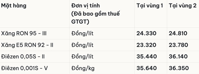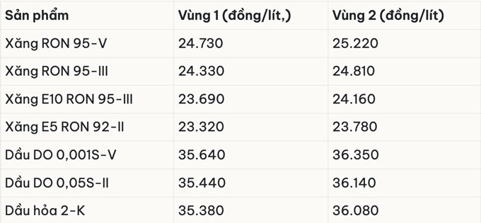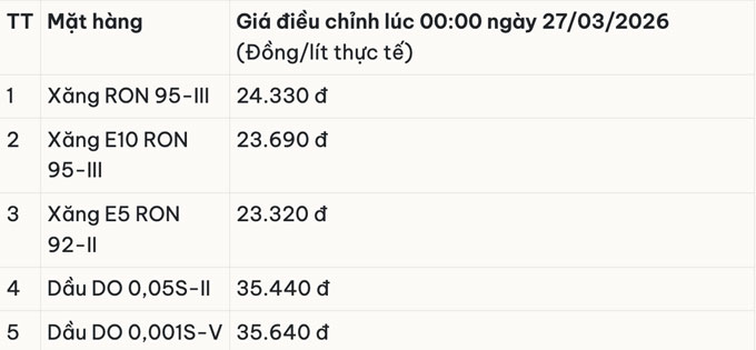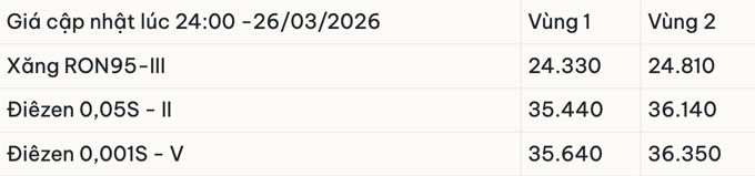 Tổng công ty Xăng dầu Quân đội (Mipecorp) điều chỉnh giá các mặt hàng xăng dầu từ 24h00' ngày 26/3/2026, mức giá mới cụ thể như sau: