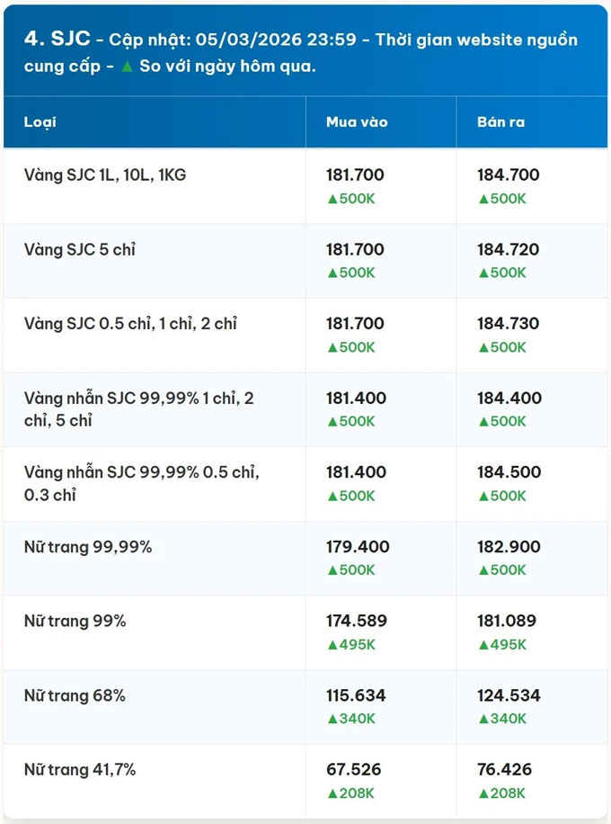 Cập nhật lúc 4h hôm nay 6/3/2026, giá vàng miếng SJC chốt phiên 5/3 tăng 500 nghìn đồng/lượng ở cả hai chiều mua vào - bán ra tại hầu hết các doanh nghiệp lớn, đưa giá vàng miếng lên mức 184,7 triệu đồng/lượng.