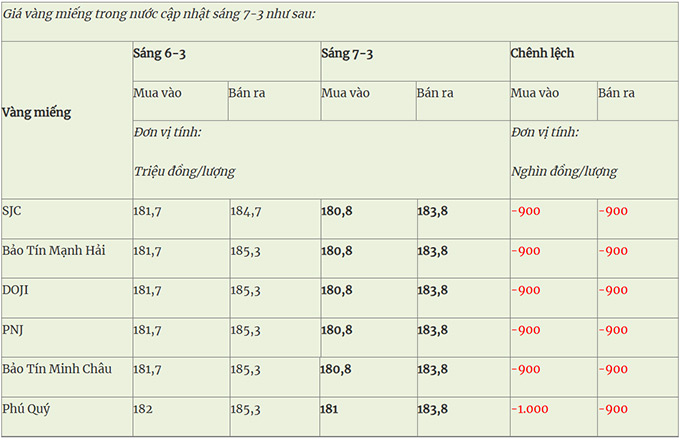 Chốt phiên giao dịch ngày 6/3, sau phiên giảm hơn 2 triệu đồng/lượng rồi lại nhanh chóng đảo chiều bật tăng. Hiện tại, giá vàng miếng SJC được niêm yết đồng giá tại SJC, PNJ, Doji và Bảo tín Minh Châu 180,8 – 183,8 triệu đồng/lượng (mua vào-bán ra) giảm 900.000 đồng/lượng ở cả hai chiều so với chốt ngày hôm qua.