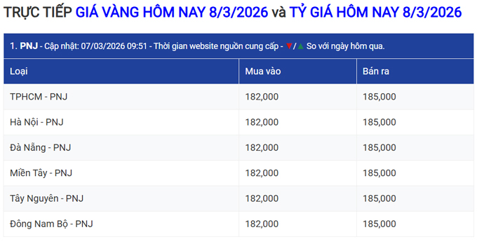 - Tập đoàn PNJ: Vàng miếng SJC 182 - 185 triệu đồng/lượng; Vàng nhẫn tròn trơn PNJ 999.9 ở mức 180,8 – 183,8 triệu đồng/lượng.