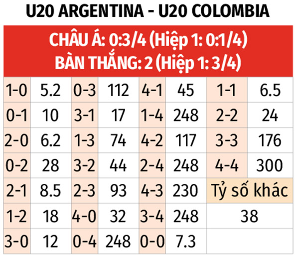 - Tối đa 2 bàn thắng: Hàng phòng ngự Argentina có thành tích sạch lưới 3 trận liên tiếp gần đây. 3/5 trận vừa qua của U20 Colombia có tối đa 2 pha làm bàn. Chưa kể, 4 trận đối đầu gần nhất cũng có tối đa 2 bàn thắng.