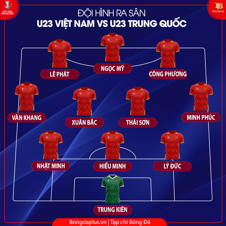 So đội hình ra sân ở trận thắng U23 UAE ở tứ kết U23 châu Á 2026, HLV Kim Sang Sik có một điều chỉnh ở đội hình xuất phát khi U23 Việt Nam đối đầu với U23 Trung Quốc ở bán kết. Theo đó, tiền đạo Công Phương sẽ thay Viktor Lê đá chính, chơi với Lê Phát và Ngọc Mỹ để tạo nên 3 mũi giáp công lợi hại trên tuyến đầu.