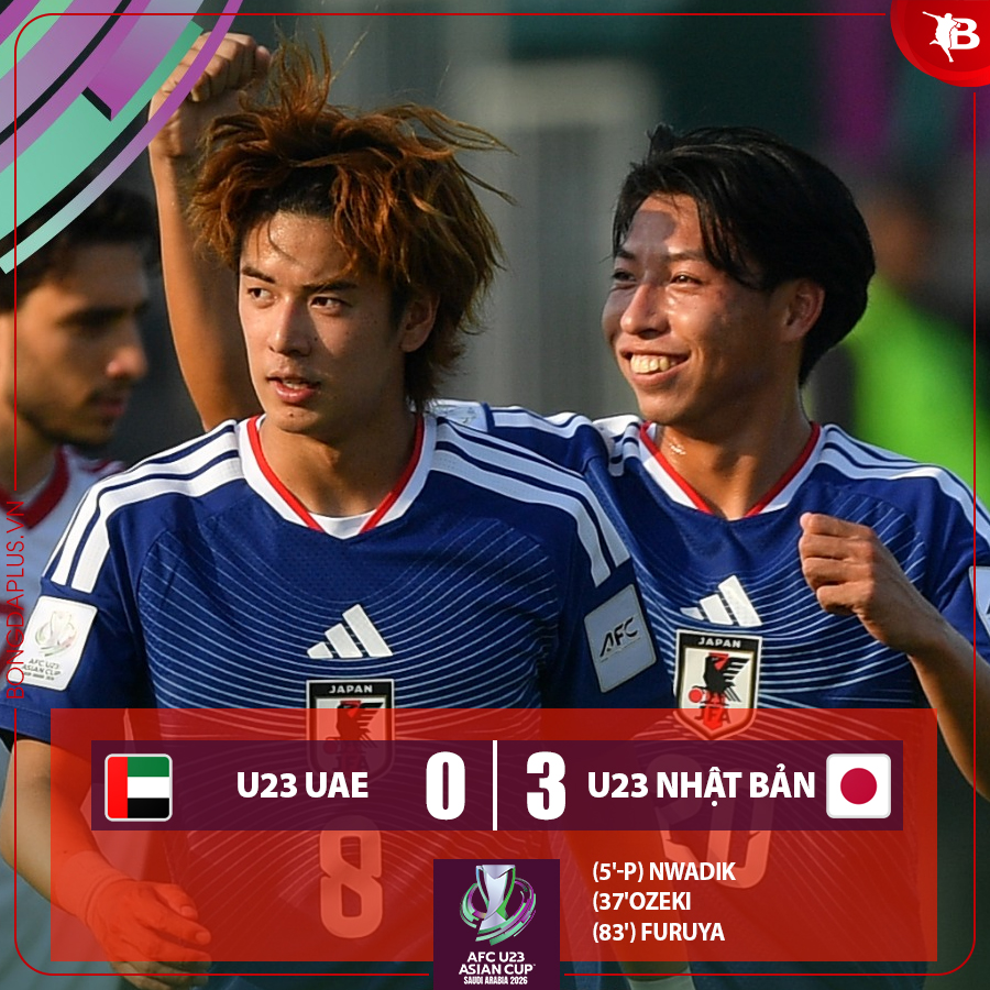 U23 Nhật Bản: Brian Nwadik (pen, 5’), Yuto Ozeki (37’), Rion Ichihara (83’)