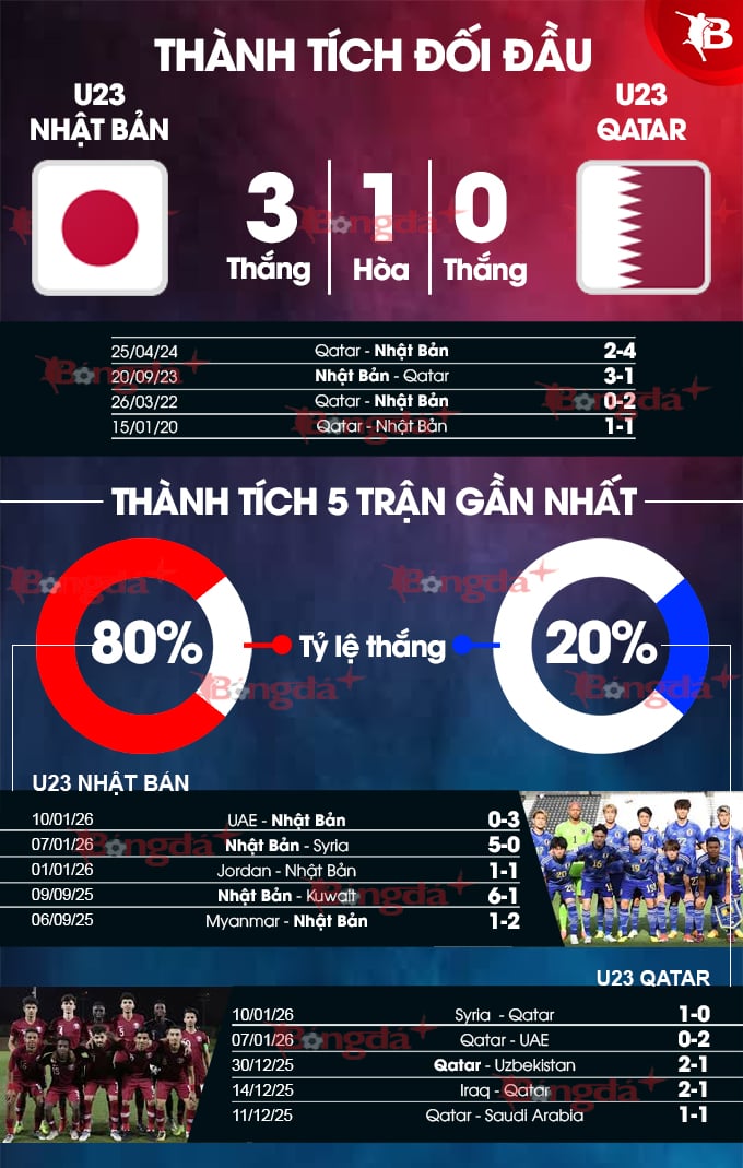 - Hai đội cùng ghi bàn: U23 Nhật Bản ghi bàn trong 10 trận gần nhất. Qatar cũng ghi bàn 3/5 trận gần nhất. 3/4 lần gặp nhau gần đây, cả hai đội đều ghi bàn.