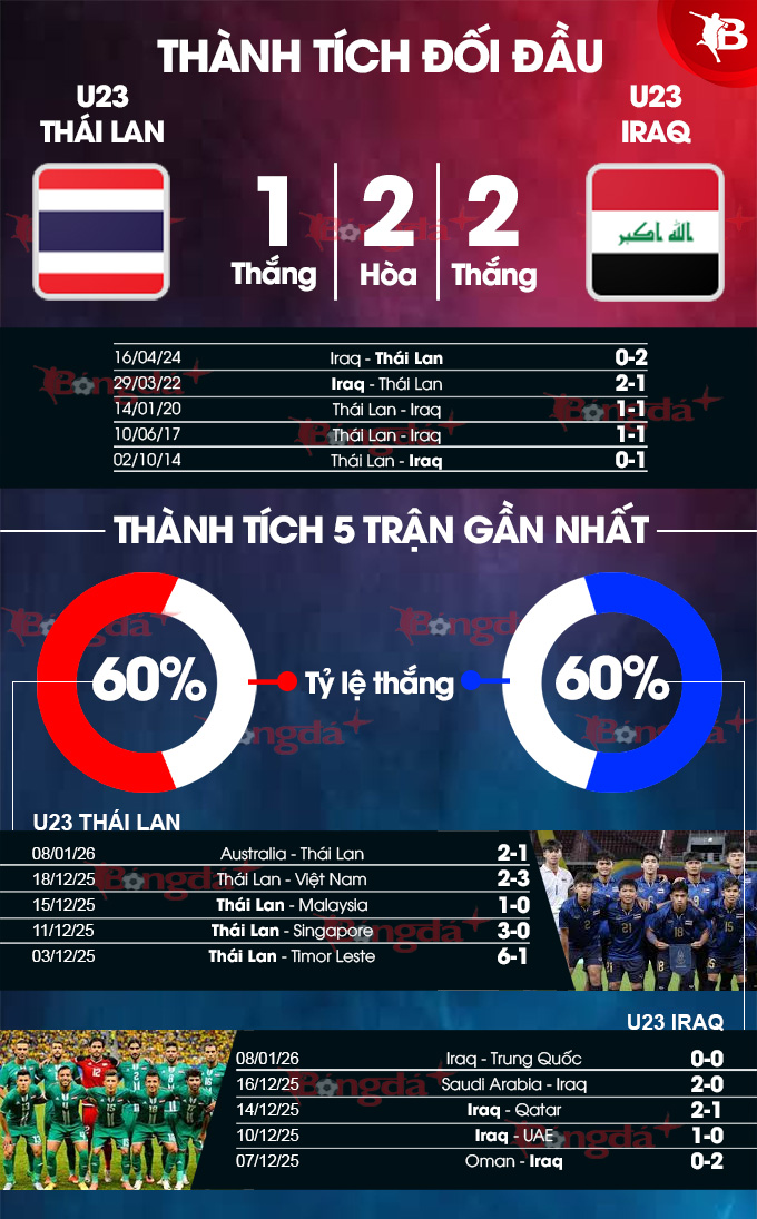 - Cả 2 đội đều ghi bàn: U23 Thái Lan ghi bàn trong 8/9 trận gần đây. 6/8 trận gần nhất, U23 Iraq đều ghi bàn. 3/5 trận đối đầu, cả hai đội đều có bàn thắng.