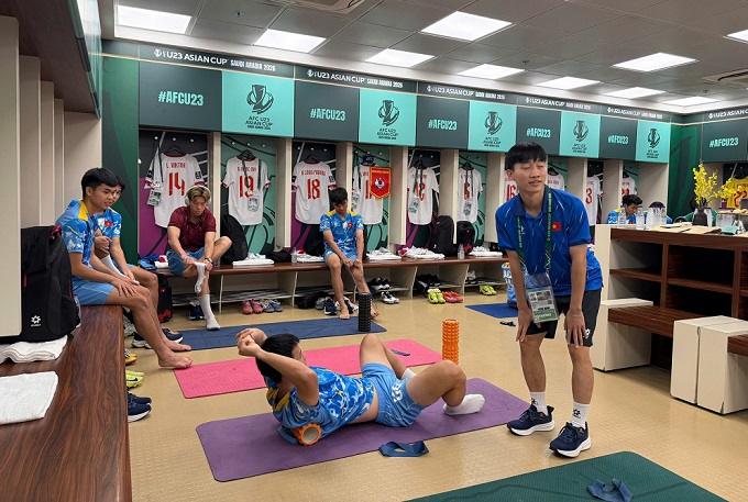 U23 Việt Nam đã ra sân để khởi động. Trước khi khởi động trên sân, các cầu thủ được đội ngũ y tế chăm sóc để đảm bảo được trạng thái tốt nhất.