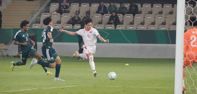 Văn Khang nỗ lực bên cánh trái rồi chuyền bóng để Viktor Lê dứt điểm cận thành nhưng bị hậu vệ Saudi Arabia kèm sát nên không thể tung cú sút.