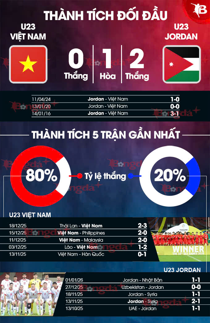 Trong lịch sử 3 lần đối đầu, U23 Việt Nam chưa thắng U23 Jordan. Cụ thể, U23 Việt Nam thua 1 trận và hòa 2 trận còn lại.