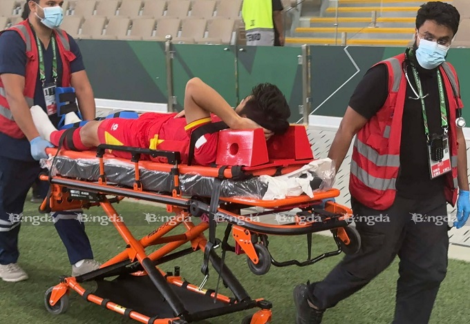 Một cầu thủ U23 Trung Quốc bị chuột rút, nằm sân.