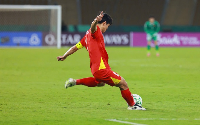 Văn Khang tung cú sút phạt nhưng thủ môn Li Hao xuất sắc cản phá.