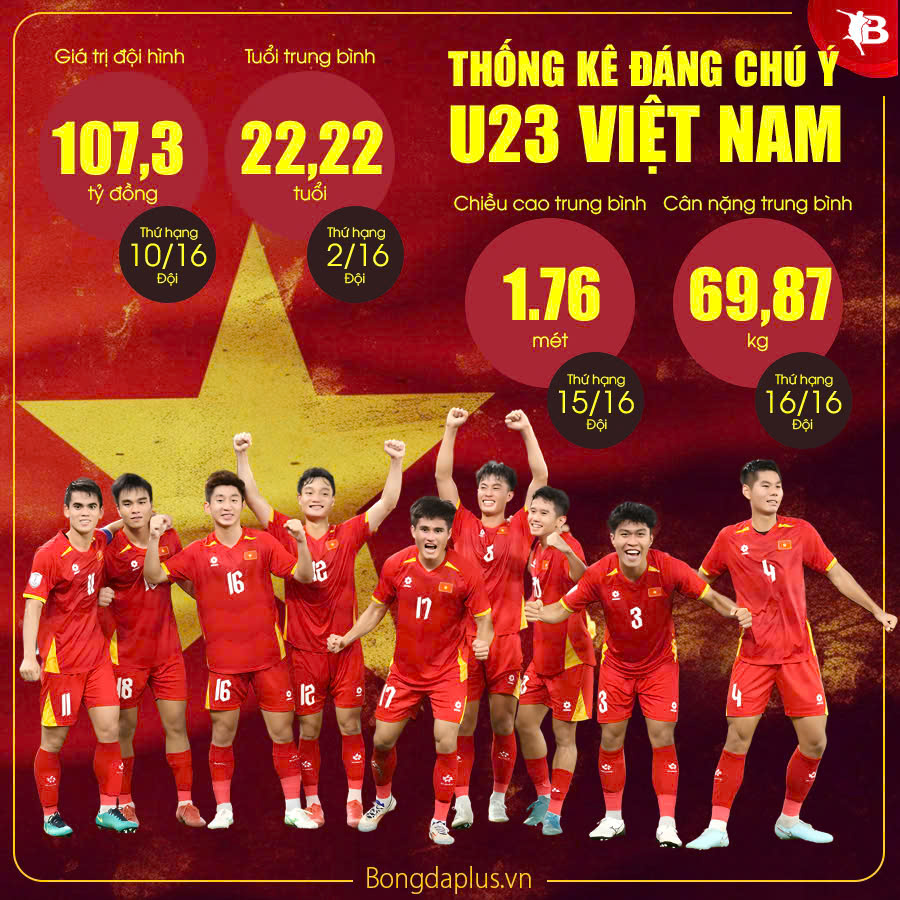 Thống kê đáng chú ý về U23 Việt Nam - Giá trị đội hình: 107,3 tỷ đồng (thứ 10/16 đội) - Tuổi trung bình: 22,22 tuổi (thứ 2/16 đội) - Chiều cao trung bình: 1,76 m (thứ 15/16 đội) - Cân nặng trung bình: 69,87 kg (thứ 16/16 đội) |
