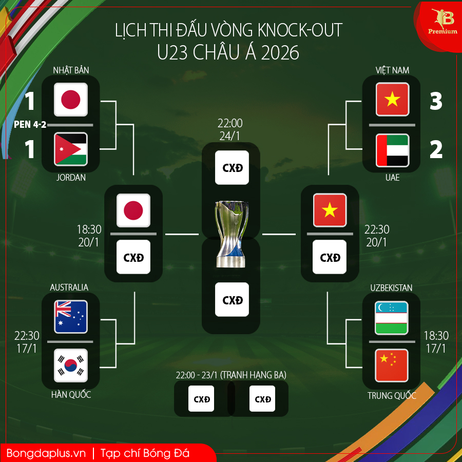 U23 Việt Nam đã trải qua 120 phút nghẹt thở nhưng đầy quả cảm để hạ U23 UAE với tỷ số sít sao 3-2, qua đó tiến vào bán kết. Cần biết rằng, đây là chiến thắng đầu tiên sau 7 trận không biết đến mùi chiến thắng của U23 Việt Nam trước đối thủ này. Tiến vào bán kết, thầy trò ông Kim Sang Sik sẽ thi đấu lúc 22h30 ngày 20/1 tới cũng trên sân Prince Abdullah Al-Faisal Sports City, sân đấu vừa giúp U23 Việt Nam hạ chủ nhà U23 Saudi Arabia và U23 UAE.