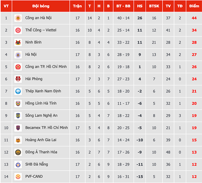 CLB Công an Hà Nội thắng đậm 5-1 trước Đà Nẵng, qua đó đứng vững ở ngôi đầu bảng với 44 điểm. Khoảng cách giữa thầy trò HLV Mano Polking so với hai đội đứng cuối là Đà Nẵng, PVF-CAND đã lên tới 32 điểm. Trong bối cảnh V.League 2025/26 chỉ còn 9 vòng đấu, cơ hội vô địch trên lý thuyết của 2 đội bóng này đã không còn.