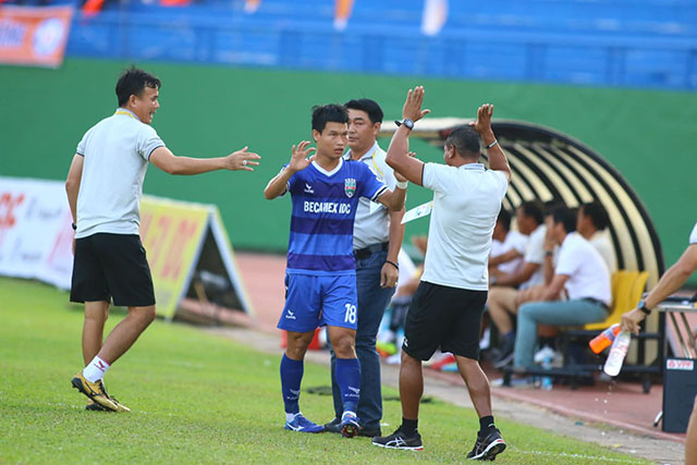 Đông Triều chia vui cùng BHL B.BD. Ảnh: Hoàng Viên