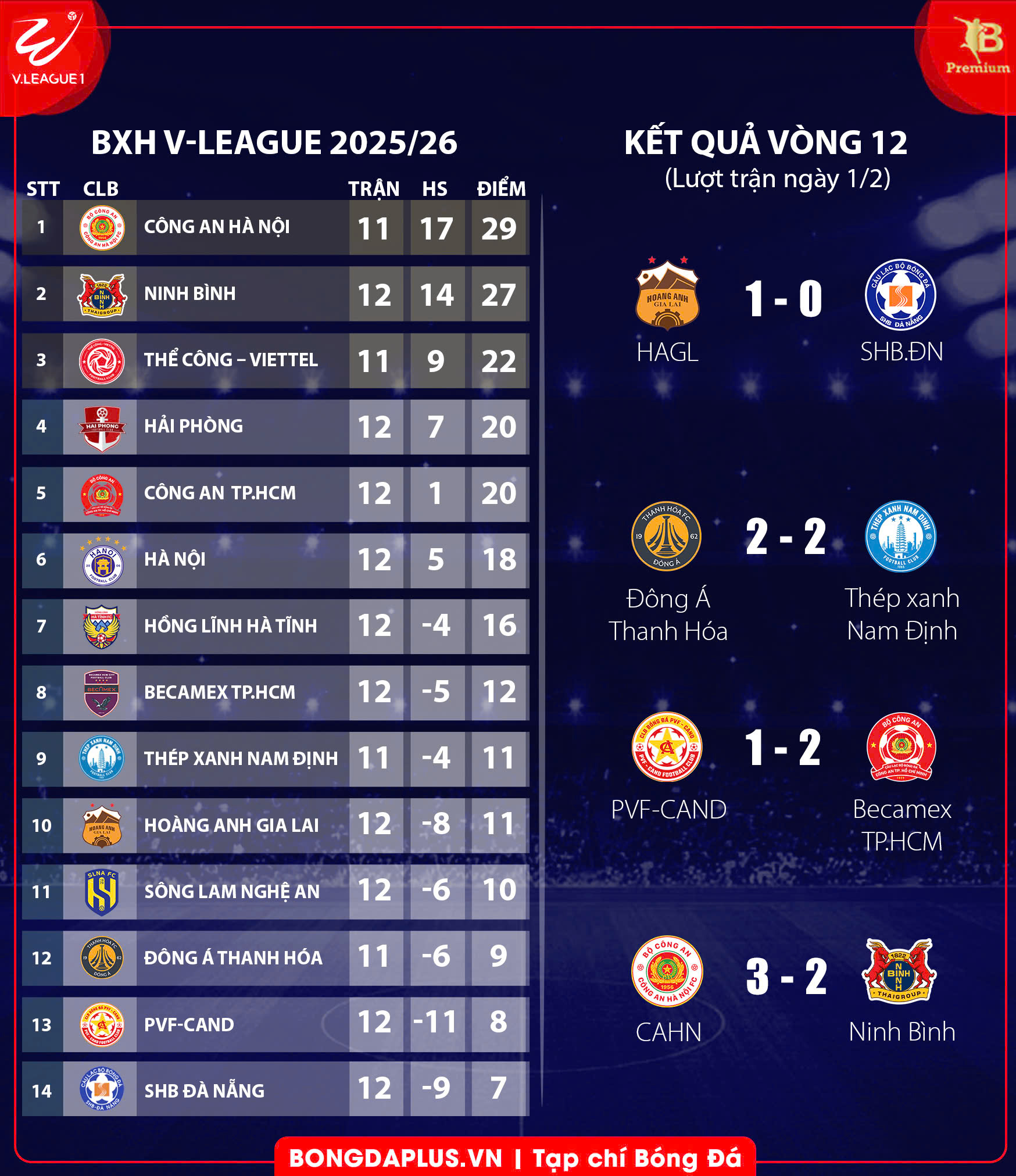 Trận cầu tâm điểm của vòng 12 V.League 2025/26 giữa hai đội xếp đầu bảng là CLB Công an Hà Nội và Ninh Bình đã diễn ra hấp dẫn đúng như kỳ vọng của người hâm mộ. Ngay ở phút thứ 2, Hoàng Đức mở ra cánh trái cho đồng đội treo vào vòng cấm. Geovane ngả người bắt vô-lê bằng chân trái đưa bóng qua khe giữa hai chân của Văn Hậu, khiến Nguyễn Filip nhoài người hết cỡ cũng không thể cứu thua cho CAHN.