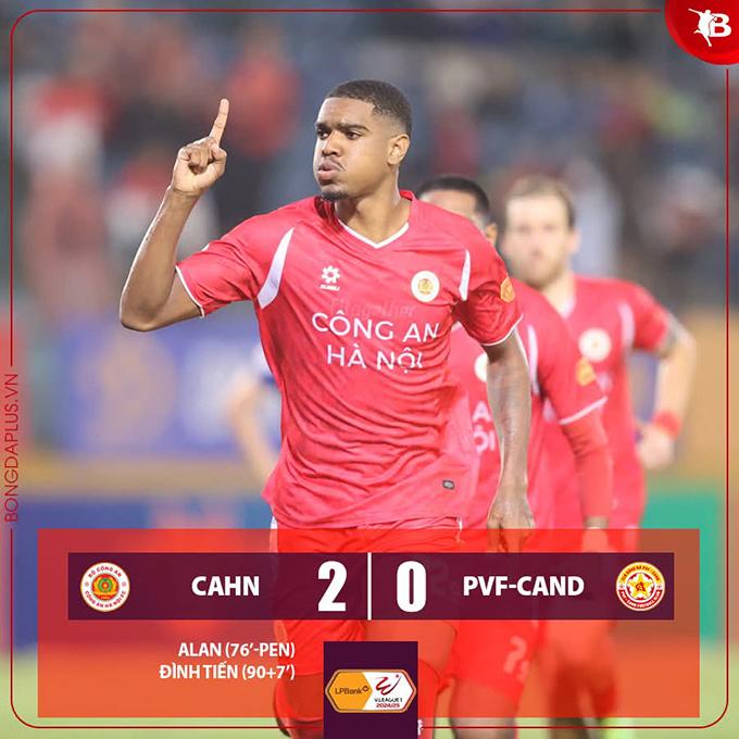 Công an Hà Nội: Alan (75’ phạt đền), Đình Tiến (90’+6)