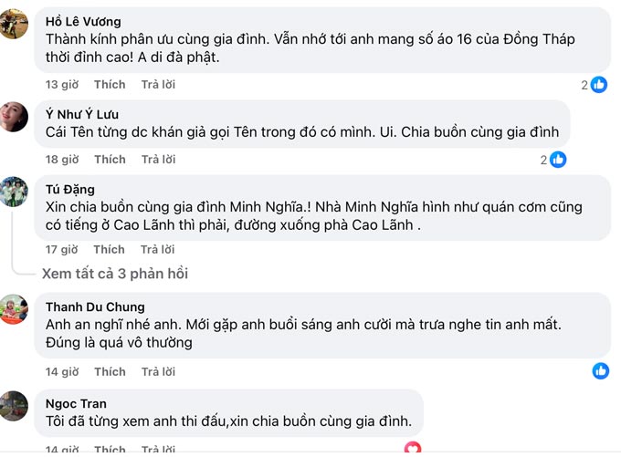 Dưới các bài đăng tưởng niệm, nhiều bình luận khiến người đọc nghẹn lòng. Tài khoản Trịnh Quốc Đạt viết: “Lâu lắm mới nghe lại tên anh, không ngờ là trong hoàn cảnh này. Xin chia buồn cùng gia đình, mong anh ra đi thanh thản.” Một cổ động viên khác nhớ về “cặp đôi Trung Vĩnh – Minh Nghĩa” từng làm nên sức sống cho hàng công Đồng Tháp.