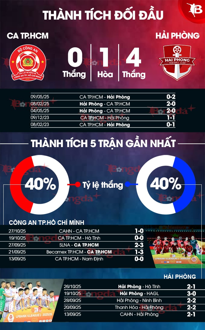 Hải Phòng chưa bao giờ là đối thủ dễ chơi với CA TP.HCM. Trong quá khứ, khi còn thi đấu với tên gọi cũ, đội chủ nhà thường giành những kết quả không tốt trước đại diện đến từ đất Cảng. Trong 5 trận đối đầu gần nhất, CA TP.HCM thua 4 và hòa 1 trận trước Hải Phòng. Ngay ở mùa giải năm ngoái, CA TP.HCM nhận cả 2 thất bại trong 2 lượt trận trước Hải Phòng. Mùa giải năm nay, dù có nhiều sự thay đổi tích cực nhưng xem ra, CA TP.HCM cũng khó lòng có thể phá dớp chỉ hòa và thua trước Hải Phòng.