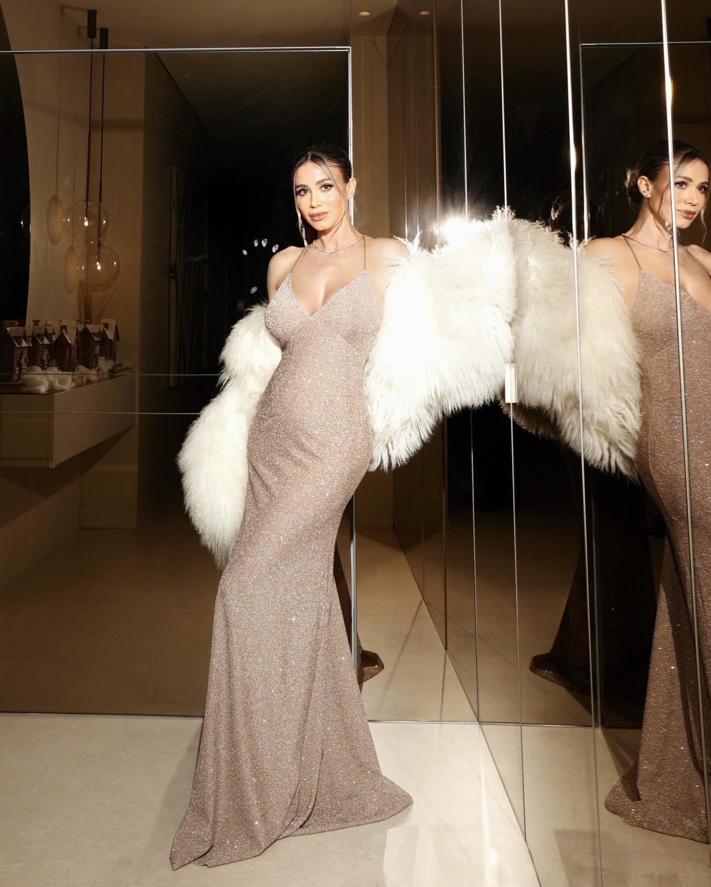 Trong bộ ảnh mới, Leotta xuất hiện cuốn hút với chiếc váy vàng ôm sát, khoe trọn vóc dáng cùng chiếc bụng bầu. Thiết kế cổ khoét sâu tinh tế giúp tôn lên vẻ quyến rũ ngay cả khi vòng 2 đã to dần. Cô tạo dáng bên cây thông Noel, hòa mình vào không gian lễ hội rực rỡ và sang trọng.