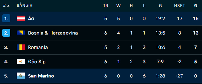 Đại thắng, ĐT Áo dẫn đầu bảng H (15 điểm/5 trận), hơn đội xếp sau Bosnia 2 điểm nhưng đá ít hơn 1 trận. Như vậy, nếu cứ duy trì phong độ như hiện tại, tấm vé trực tiếp dự VCK World Cup 2026 khó thoát khỏi tay Áo.