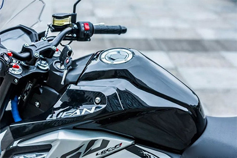 Bình xăng xe gồ cao, cánh gió hai bên thiết kế kéo dài xuống phía dưới rất sắc sảo. Khung xe là loại khung ống thép dạng lưới, phần khung phụ phía sau được che kín khéo léo bằng ốp thân và ốp đuôi xe.